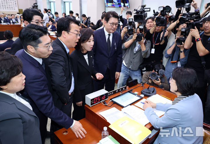 [서울=뉴시스] 김금보 기자 = 나경원 국민의힘 의원을 비롯한 법제사법위원회 의원들이 13일 서울 여의도 국회에서 열린 법제사법위원회 국정감사에서 추미애 위원장의 국정감사 운영에 항의하고 있다. 2025.10.13. [email protected]