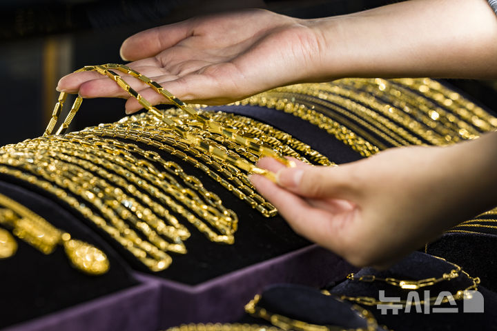 [서울=뉴시스] 김근수 기자 = 금값이 연일 최고가를 기록하는 13일 서울 종로구 골드팡 금거래소에서 직원이 금 제품을 정리하고 있다. 2025.10.13. [email protected]