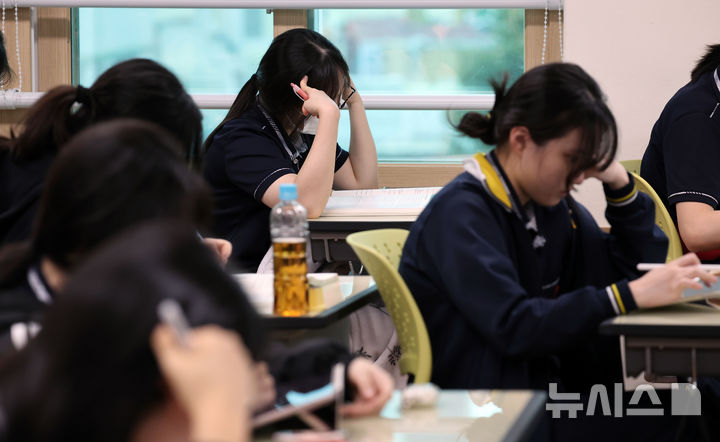 [부산=뉴시스] 하경민 기자 = 2026학년도 대학수학능력시험을 1개월 정도 앞둔 13일 부산 동래구 부산중앙여자고등학교 3학년 교실에서 수험생들이 공부에 집중하고 있다. 2025.10.13. [email protected]