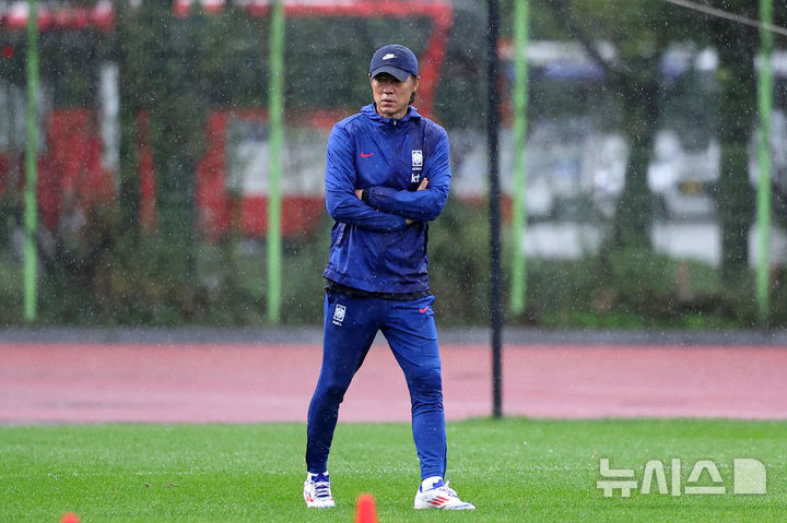 [고양=뉴시스] 김선웅 기자 = 파라과이와 평가전을 앞둔 대한민국 축구대표팀 홍명보 감독이 13일 경기 고양시 고양종합운동장 보조구장에서 훈련을 지도하고 있다. 2025.10.13. [email protected]