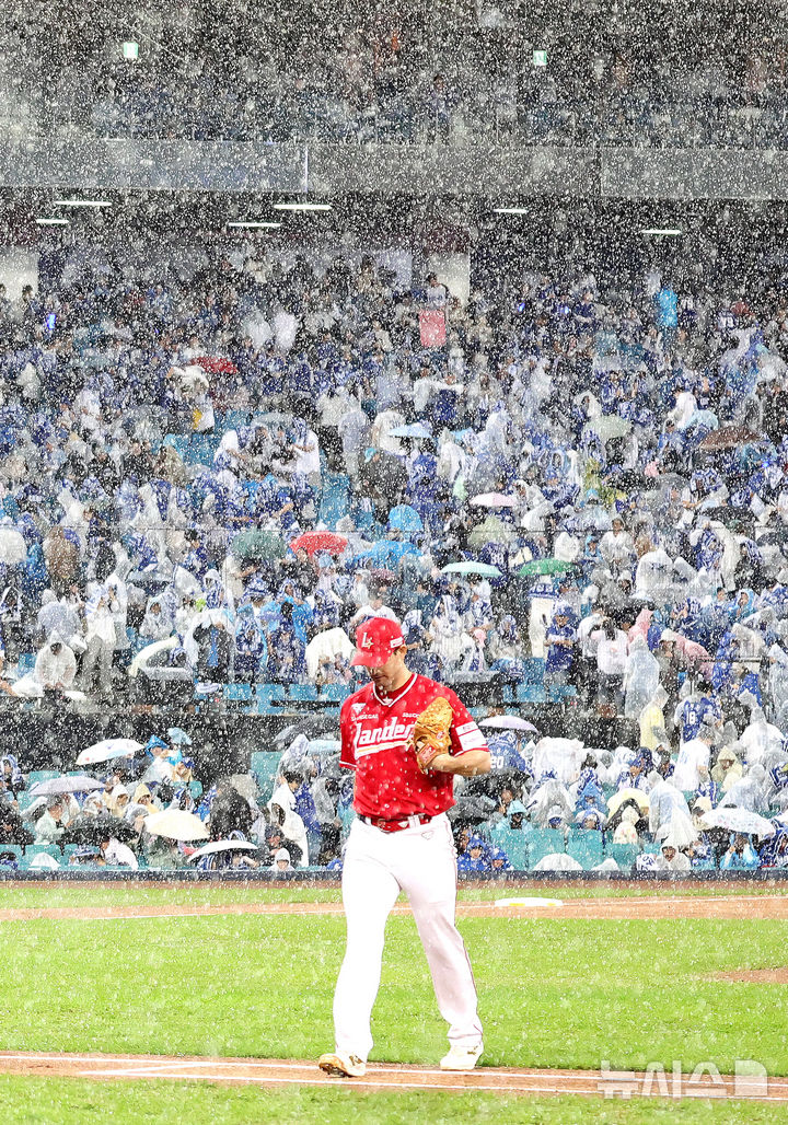 [대구=뉴시스] 이무열 기자 = 13일 대구 수성구 삼성라이온즈파크에서 열린 2025 신한 SOL 뱅크 KBO 포스트시즌 준플레이오프 3차전 SSG 랜더스와 삼성 라이온즈의 경기, 1회말 경기 도중 우천으로 경기가 중단되고 있다. 2025.10.13. [email protected]