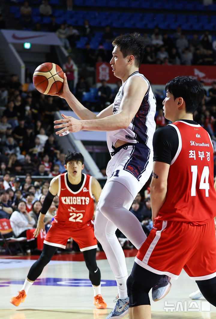 [서울=뉴시스] 최진석 기자 = 13일 서울 송파구 잠실학생체육관에서 열린 2025-2026 KBL 프로농구 서울 SK 나이츠와 부산 KCC 이지스의 경기. KCC 장재석이 패스하고 있다. 2025.10.13. [email protected]