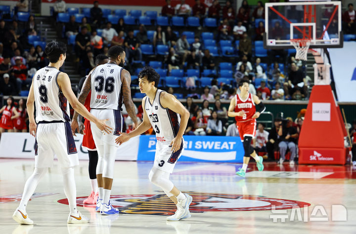 [서울=뉴시스] 최진석 기자 = 13일 서울 송파구 잠실학생체육관에서 열린 2025-2026 KBL 프로농구 서울 SK 나이츠와 부산 KCC 이지스의 경기. KCC 송교창과 허웅이 기뻐하고 있다. 2025.10.13. [email protected]