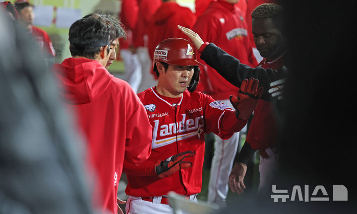 [대구=뉴시스] 이무열 기자 = 13일 대구 수성구 삼성라이온즈파크에서 열린 2025 신한 SOL 뱅크 KBO 포스트시즌 준플레이오프 3차전 SSG 랜더스와 삼성 라이온즈의 경기, 4회초 2사 주자 2루 상황에서 SSG 최지훈의 1타점 적시타 때 득점한 최정이 동료들과 기뻐하고 있다. 2025.10.13. [email protected]