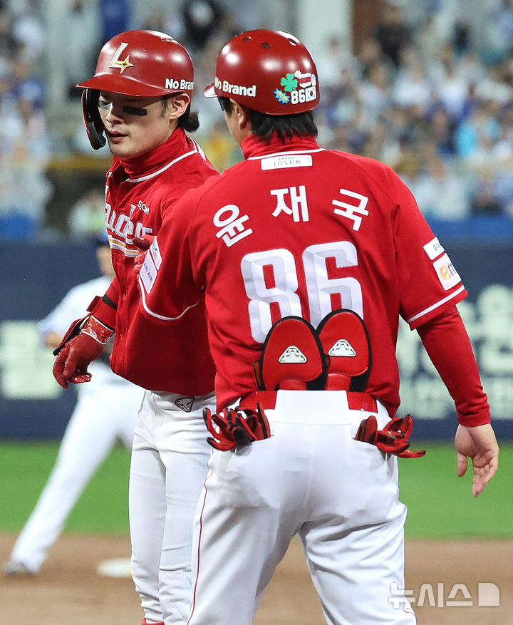 [대구=뉴시스] 이무열 기자 = 13일 대구 수성구 삼성라이온즈파크에서 열린 2025 신한 SOL 뱅크 KBO 포스트시즌 준플레이오프 3차전 SSG 랜더스와 삼성 라이온즈의 경기, 4회초 2사 주자 2루 상황에서 SSG 최지훈이 1타점 적시타를 친 뒤 윤재국 코치와 하이파이브를 하고 있다. 2025.10.13. [email protected]
