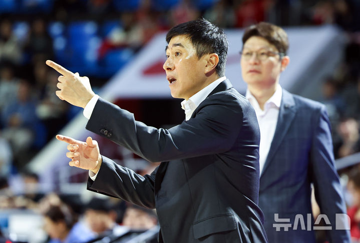 [서울=뉴시스] 최진석 기자 = 13일 서울 송파구 잠실학생체육관에서 열린 2025-2026 KBL 프로농구 서울 SK 나이츠와 부산 KCC 이지스의 경기. KCC 이상민 감독이 작전지시를 하고 있다. 2025.10.13. [email protected]