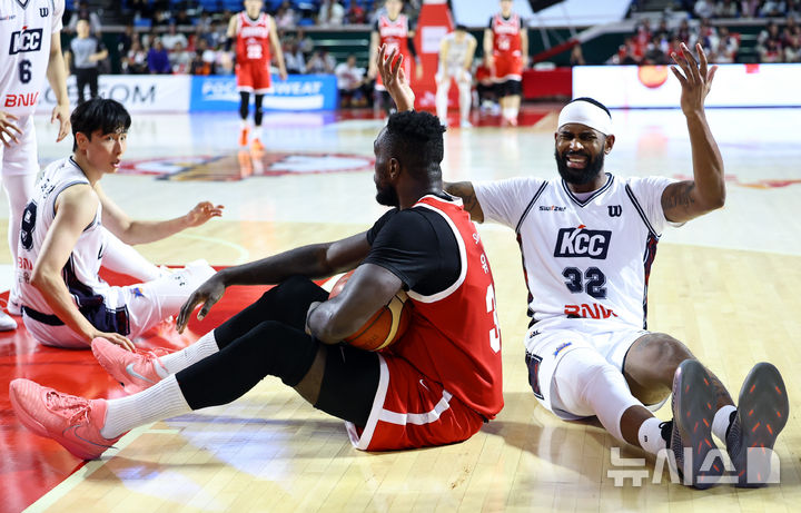 [서울=뉴시스] 최진석 기자 = 13일 서울 송파구 잠실학생체육관에서 열린 2025-2026 KBL 프로농구 서울 SK 나이츠와 부산 KCC 이지스의 경기. KCC 드완 에르난데스가 U파울을 지적당한 후 아쉬워하고 있다. 해당 U파울은 파울챌린지를 통해 일반파울로 정정되었다. 2025.10.13. [email protected]