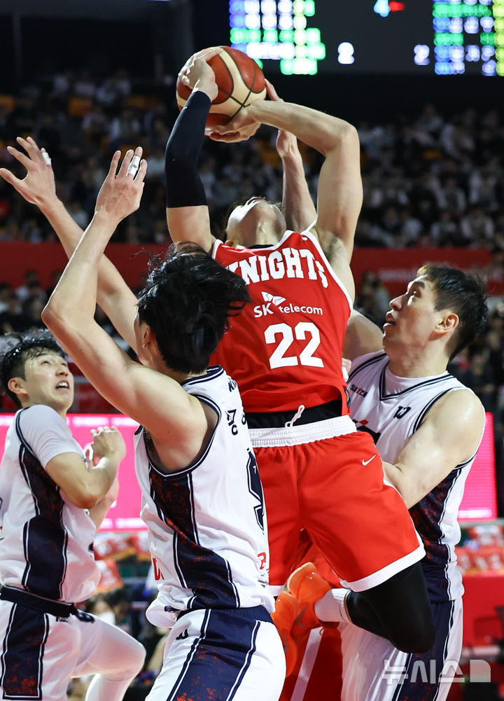 [서울=뉴시스] 최진석 기자 = 13일 서울 송파구 잠실학생체육관에서 열린 2025-2026 KBL 프로농구 서울 SK 나이츠와 부산 KCC 이지스의 경기. SK 오재현이 골밑슛을 하고 있다. 2025.10.13. [email protected]