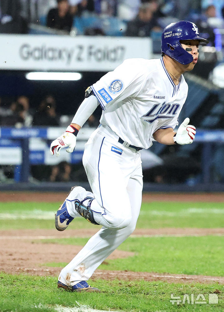 [대구=뉴시스] 이무열 기자 = 13일 대구 수성구 삼성라이온즈파크에서 열린 2025 신한 SOL 뱅크 KBO 포스트시즌 준플레이오프 3차전 SSG 랜더스와 삼성 라이온즈의 경기, 5회말 2사 주자 1,2루 상황에서 삼성 김영웅이 2타점 2루타를 치고 있다. 2025.10.13. [email protected]