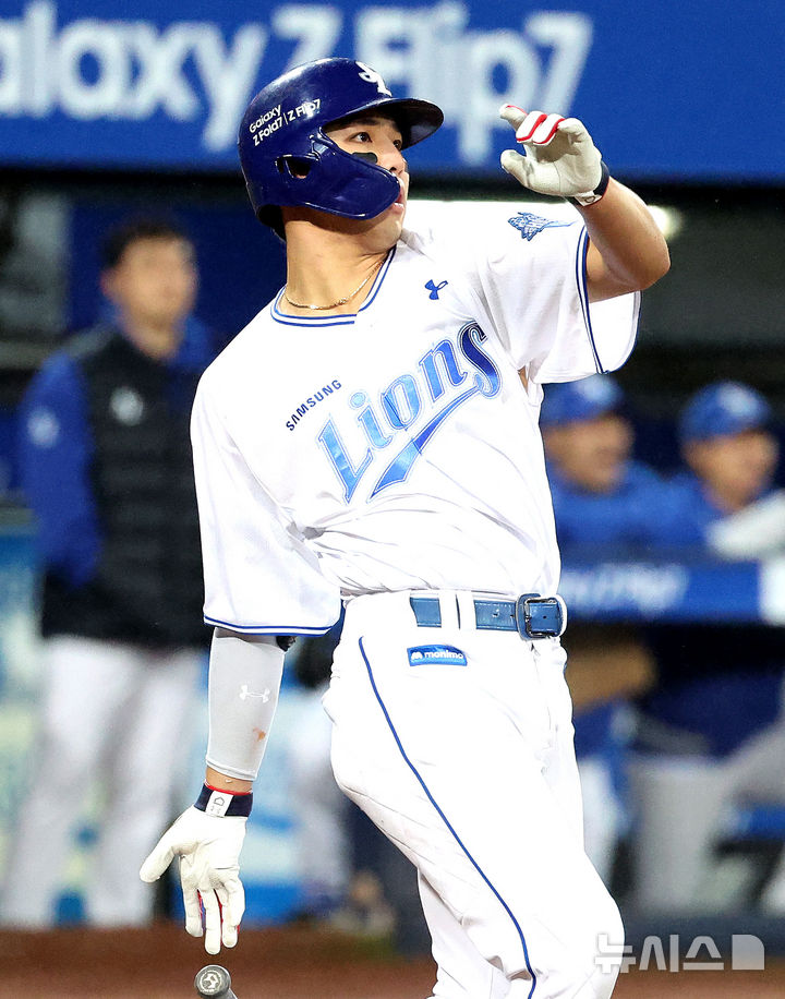 [대구=뉴시스] 이무열 기자 = 13일 대구 수성구 삼성라이온즈파크에서 열린 2025 신한 SOL 뱅크 KBO 포스트시즌 준플레이오프 3차전 SSG 랜더스와 삼성 라이온즈의 경기, 5회말 2사 주자 1,2루 상황에서 삼성 김영웅이 2타점 2루타를 치고 있다. 2025.10.13. [email protected]