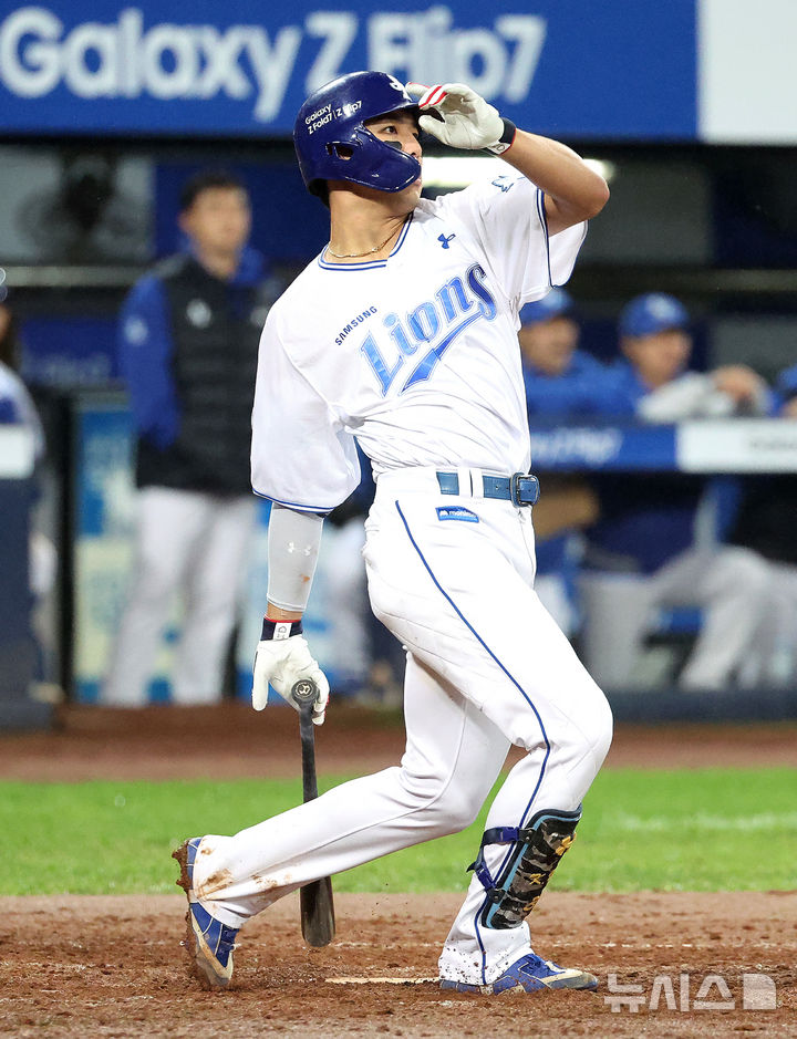 [대구=뉴시스] 이무열 기자 = 13일 대구 수성구 삼성라이온즈파크에서 열린 2025 신한 SOL 뱅크 KBO 포스트시즌 준플레이오프 3차전 SSG 랜더스와 삼성 라이온즈의 경기, 5회말 2사 주자 1,2루 상황에서 삼성 김영웅이 2타점 2루타를 치고 있다. 2025.10.13. [email protected]