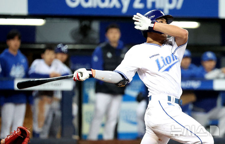 [대구=뉴시스] 이무열 기자 = 13일 대구 수성구 삼성라이온즈파크에서 열린 2025 신한 SOL 뱅크 KBO 포스트시즌 준플레이오프 3차전 SSG 랜더스와 삼성 라이온즈의 경기, 5회말 2사 주자 1,2루 상황에서 삼성 김영웅이 2타점 2루타를 치고 있다. 2025.10.13. [email protected]