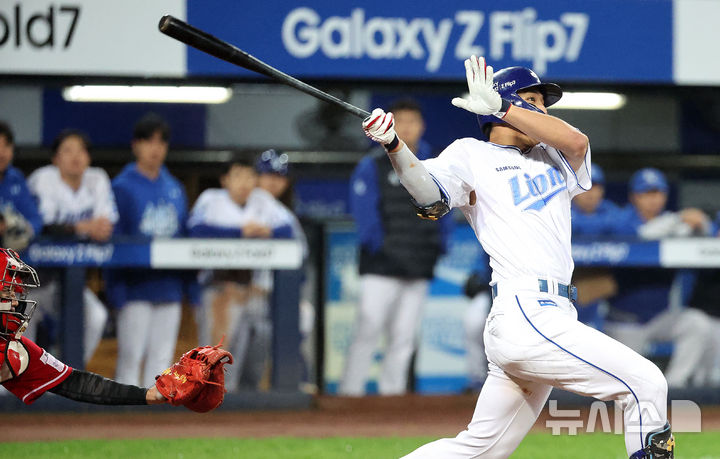 [대구=뉴시스] 이무열 기자 = 13일 대구 수성구 삼성라이온즈파크에서 열린 2025 신한 SOL 뱅크 KBO 포스트시즌 준플레이오프 3차전 SSG 랜더스와 삼성 라이온즈의 경기, 5회말 2사 주자 1,2루 상황에서 삼성 김영웅이 2타점 2루타를 치고 있다. 2025.10.13. [email protected]