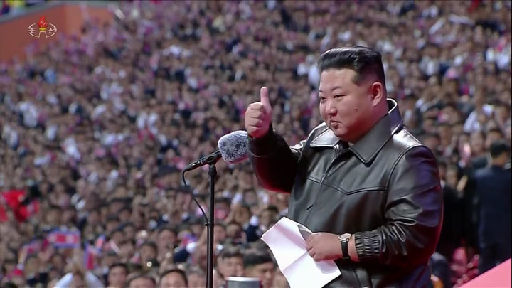 [서울=뉴시스] 김정은 북한 국무위원장이 지난 12일 노동당 창건 80주년 경축행사 참가자들과 보장성원들을 축하 격려하고 대집단체조 및 예술공연을 함께 관람했다고 북한 조선중앙TV가 13일 방영했다. (사진=조선중앙TV 캡처) 2025.10.13. [email protected] *재판매 및 DB 금지