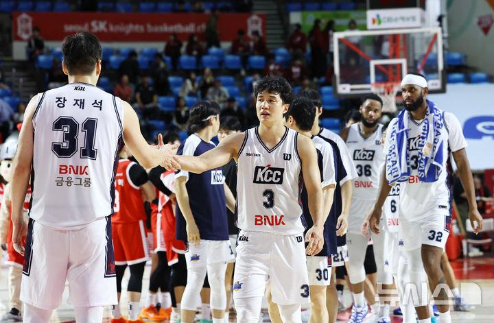 [서울=뉴시스] 최진석 기자 = 13일 서울 송파구 잠실학생체육관에서 열린 2025-2026 KBL 프로농구 서울 SK 나이츠와 부산 KCC 이지스의 경기에서 75대67로 승리를 거둔 KCC 장재석과 허웅이 기뻐하고 있다. 2025.10.13. [email protected]