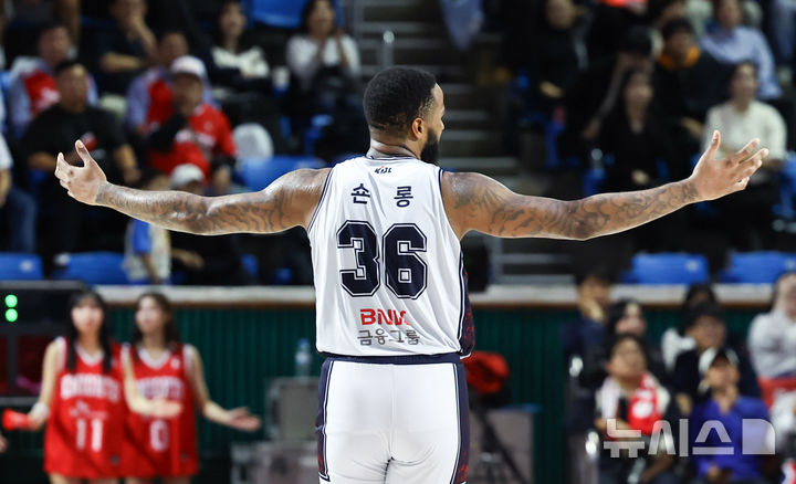 [서울=뉴시스] 최진석 기자 = 13일 서울 송파구 잠실학생체육관에서 열린 2025-2026 KBL 프로농구 서울 SK 나이츠와 부산 KCC 이지스의 경기. KCC 숀 롱이 득점 후 기뻐하고 있다. 2025.10.13. [email protected]