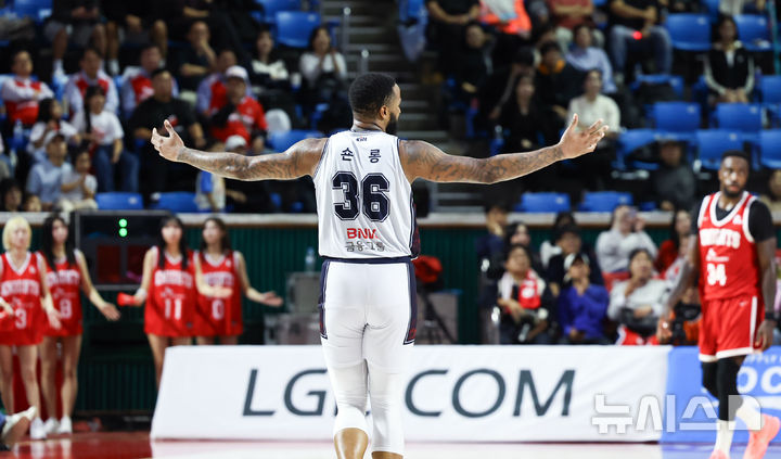[서울=뉴시스] 최진석 기자 = 13일 서울 송파구 잠실학생체육관에서 열린 2025-2026 KBL 프로농구 서울 SK 나이츠와 부산 KCC 이지스의 경기. KCC 숀 롱이 득점 후 기뻐하고 있다. 2025.10.13. [email protected]