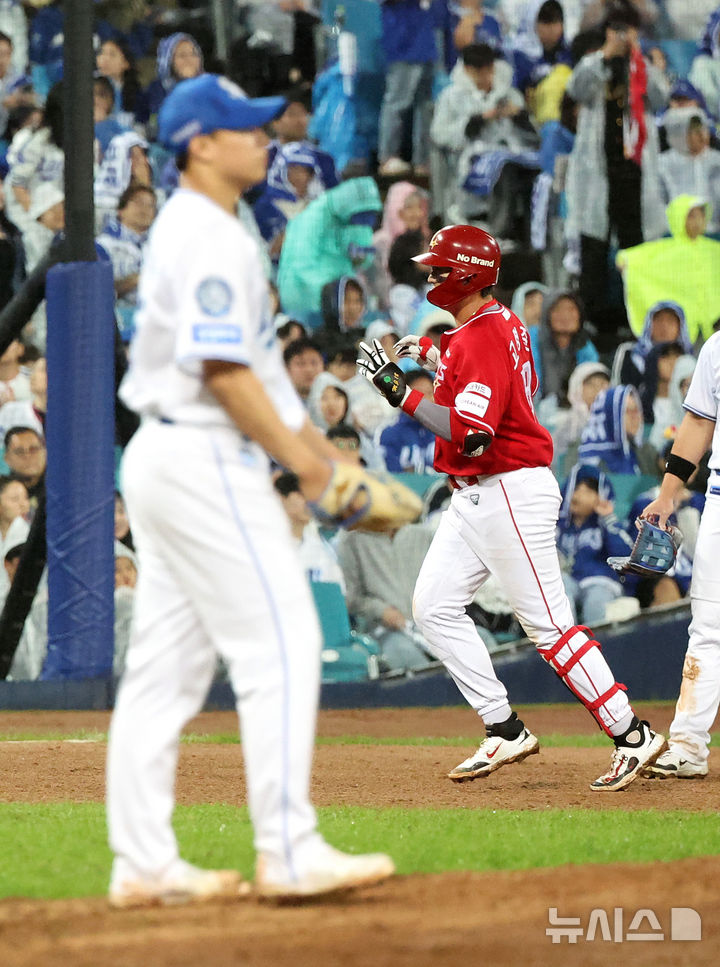[대구=뉴시스] 이무열 기자 = 13일 대구 수성구 삼성라이온즈파크에서 열린 2025 신한 SOL 뱅크 KBO 포스트시즌 준플레이오프 3차전 SSG 랜더스와 삼성 라이온즈의 경기, 9회초 무사 주자 1루 상황에서 SSG 고명준이 투런 홈런을 친 뒤 그라운드를 돌고 있다. 2025.10.13. [email protected]