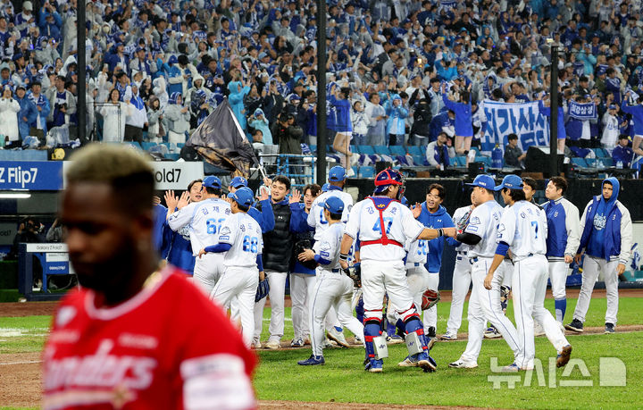 [대구=뉴시스] 이무열 기자 = 13일 대구 수성구 삼성라이온즈파크에서 열린 2025 신한 SOL 뱅크 KBO 포스트시즌 준플레이오프 3차전 SSG 랜더스와 삼성 라이온즈의 경기, 5-3으로 승리한 삼성 선수들이 기뻐하고 있다. 2025.10.13. [email protected]