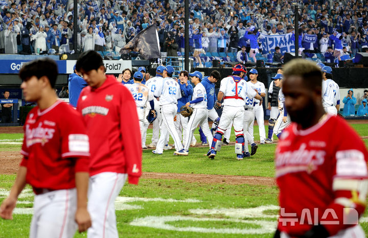 [대구=뉴시스] 이무열 기자 = 13일 대구 수성구 삼성라이온즈파크에서 열린 2025 신한 SOL 뱅크 KBO 포스트시즌 준플레이오프 3차전 SSG 랜더스와 삼성 라이온즈의 경기, 5-3으로 승리한 삼성 선수들이 기뻐하고 있다. 2025.10.13. [email protected]