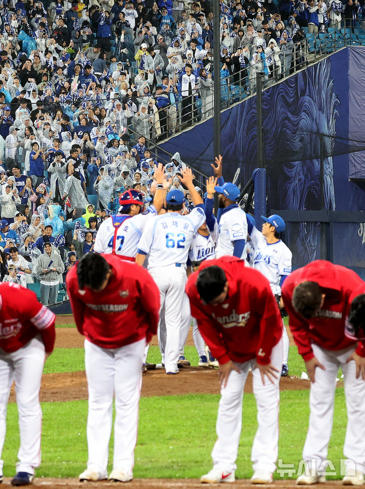 [대구=뉴시스] 이무열 기자 = 13일 대구 수성구 삼성라이온즈파크에서 열린 2025 신한 SOL 뱅크 KBO 포스트시즌 준플레이오프 3차전 SSG 랜더스와 삼성 라이온즈의 경기, 5-3으로 승리한 삼성 선수들이 기뻐하고 있다. 2025.10.13. [email protected]