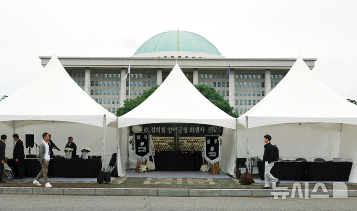[서울=뉴시스] 고승민 기자 = 14일 오전 서울 여의도 국회 본청 앞에 국민의힘이 설치한 고 정희철 양평군청 면장의 분향소에서 관계자들이 분주한 모습을 보이고 있다. 2025.10.14. [email protected]