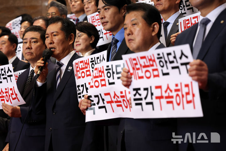 [서울=뉴시스] 김명년 기자 = 정청래 더불어민주당 대표가 14일 오전 서울 여의도 국회 로텐더홀에서 한덕수 전 국무총리 등 국무위원 내란 공모 기자회견을 열고 발언하고 있다. 2025.10.14. [email protected]