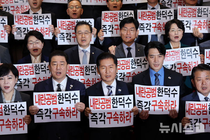 [서울=뉴시스] 김명년 기자 = 정청래 더불어민주당 대표와 김병기 원내대표 등 의원들이 14일 오전 서울 여의도 국회 로텐더홀에서 한덕수 전 국무총리 등 국무위원 내란 공모 기자회견을 열고 구호를 외치고 있다. 2025.10.14. [email protected]