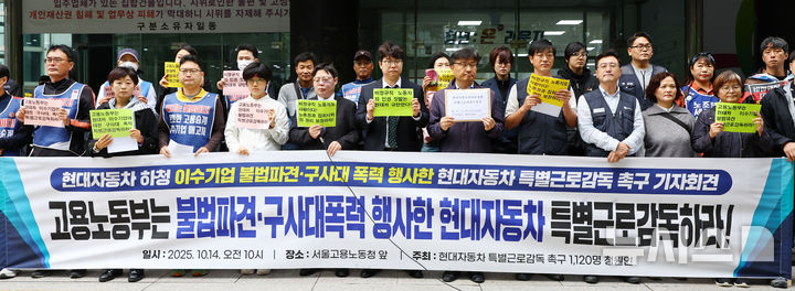[서울=뉴시스] 박주성 기자 = 현대자동차 특별근로감독 촉구 1120명 청원인들이 14일 오전 서울 중구 서울고용노동청 앞에서 현대자동차 하청 이수기업 불법파견·구사대 폭력 행사한 현대자동차 특별근로감독 촉구 기자회견을 하고 있다. 2025.10.14. [email protected]