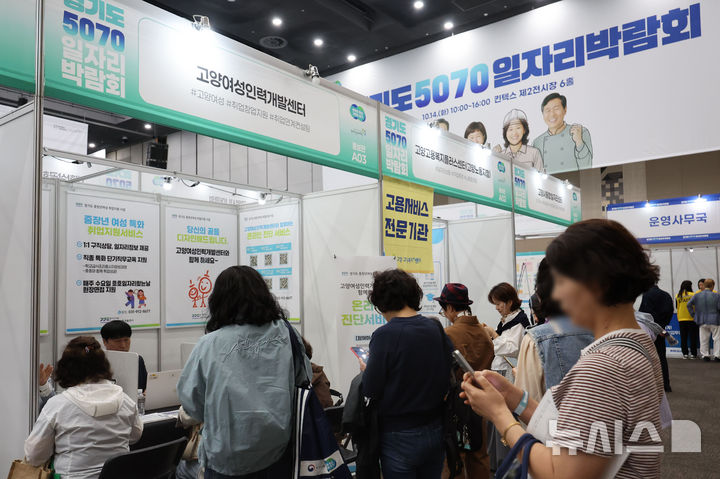 [고양=뉴시스] 권창회 기자 = 14일 오후 경기 고양시 킨텍스에서 열린 경기도 5070 일자리박람회에서 구직자들이 상담을 받기 위해 줄 서 있다. 2025.10.14. [email protected]