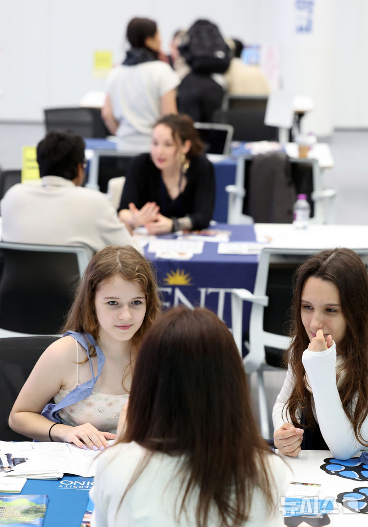 [부산=뉴시스] 하경민 기자 = 'PKNU 글로벌 유학박람회'가 열린 14일 부산 남구 국립부경대학교 부경컨벤션홀에서 국제학교 학생 등이 미국 대학 진학 상담을 하고 있다.