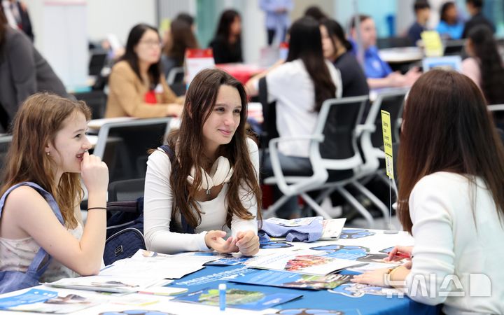 [부산=뉴시스] 하경민 기자 = 'PKNU 글로벌 유학박람회'가 열린 14일 부산 남구 국립부경대학교 부경컨벤션홀에서 국제학교 학생 등이 미국 대학 진학 상담을 하고 있다.