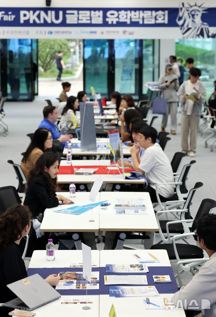 [부산=뉴시스] 하경민 기자 = 'PKNU 글로벌 유학박람회'가 열린 14일 부산 남구 국립부경대학교 부경컨벤션홀에서 국제학교 학생 등이 미국 대학 진학 상담을 하고 있다.