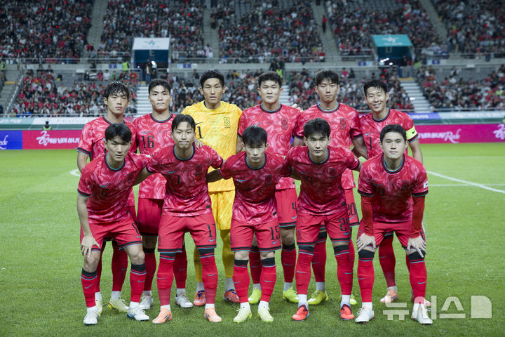 [서울=뉴시스] 김근수 기자 = 대한민국 축구 국가대표팀 선수들이 14일 오후 서울 마포구 서울월드컵경기장에서 열린 하나은행 초청 축구국가대표팀 친선경기 대한민국과 파라과이의 경기 시작에 앞서 팀 포토를 찍고 있다. 2025.10.14. [email protected]