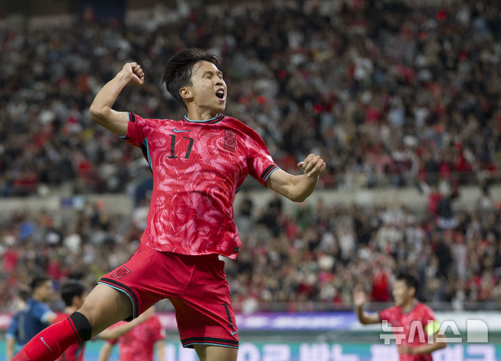 [서울=뉴시스] 김근수 기자 = 14일 오후 서울 마포구 서울월드컵경기장에서 열린 하나은행 초청 축구국가대표팀 친선경기 대한민국과 파라과이의 경기. 전반 대한민국 엄지성이 선취골을 뽑아내고 세리머니를 하고 있다. 2025.10.14. [email protected]