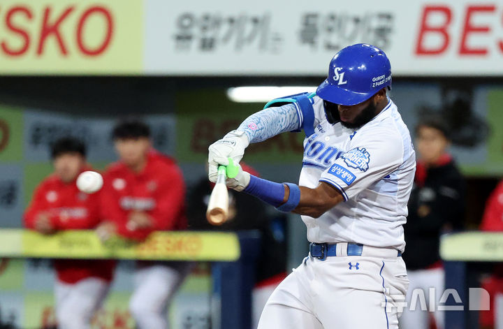 [대구=뉴시스] 이무열 기자 = 14일 대구 수성구 삼성라이온즈파크에서 열린 2025 신한 SOL 뱅크 KBO 포스트시즌 준플레이오프 4차전 SSG 랜더스와 삼성 라이온즈의 경기, 6회말 무사 주자 1,2루 상황에서 삼성 다이즈가 1타점 적시타를 치고 있다. 202510.14. [email protected]