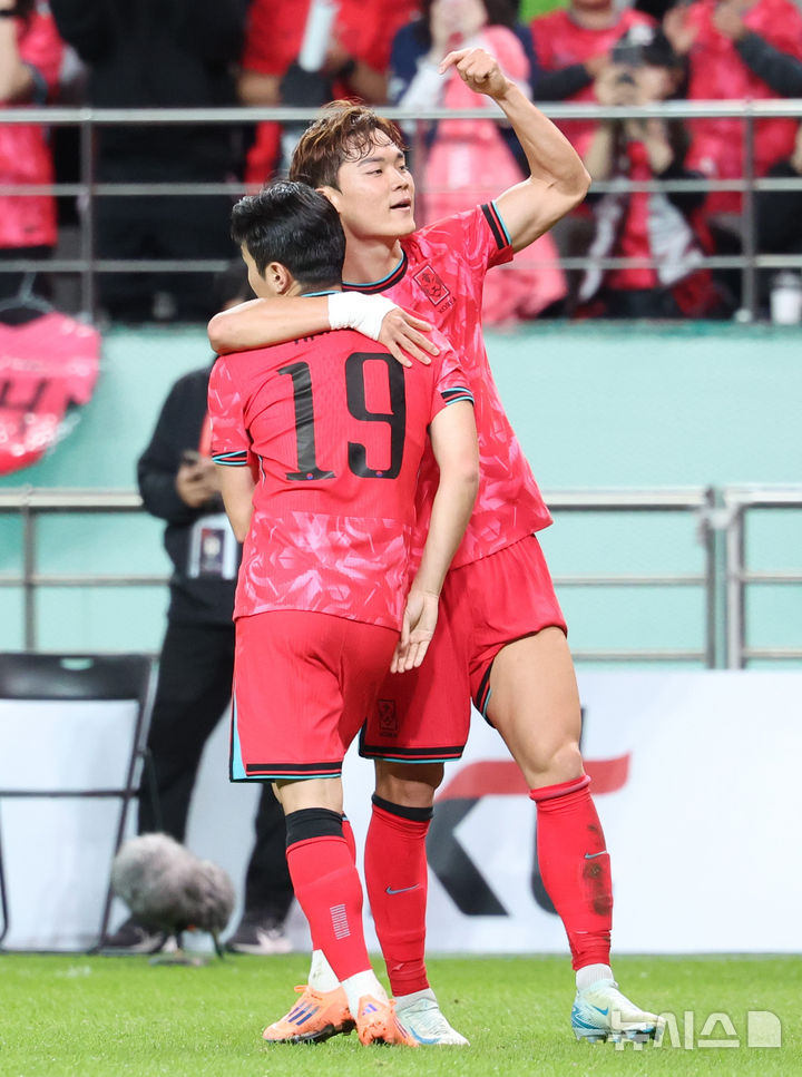 [서울=뉴시스] 이영환 기자 = 14일 오후 서울 마포구 서울월드컵경기장에서 열린 하나은행 초청 축구국가대표팀 친선경기 대한민국과 파라과이의 경기 후반전, 대한민국 오현규가 팀의 두 번째 골을 넣고 이강인과 기뻐하고 있다. 2025.10.14. [email protected]