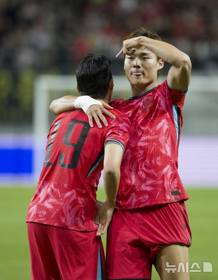 [서울=뉴시스] 김근수 기자 = 14일 오후 서울 마포구 서울월드컵경기장에서 열린 하나은행 초청 축구국가대표팀 친선경기 대한민국과 파라과이의 경기 후반 대한민국 오현규가 추가골을 넣고 이강인과 기뻐하고 있다. 2025.10.14. [email protected]