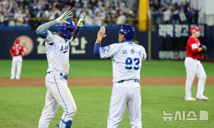 [대구=뉴시스] 이무열 기자 = 14일 대구 수성구 삼성라이온즈파크에서 열린 2025 신한 SOL 뱅크 KBO 포스트시즌 준플레이오프 4차전 SSG 랜더스와 삼성 라이온즈의 경기, 8회말 2사 주자 1루 상황에서 삼성 디아즈가 역전 투런 홈런을 친 뒤 이종욱 코치와 기뻐하고 있다. 2025.10.14. [email protected]
