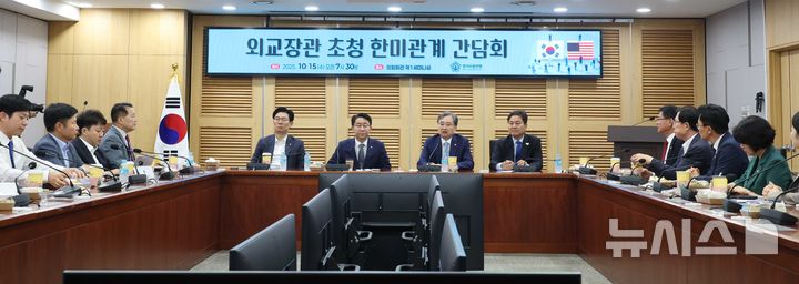 [서울=뉴시스] 조성봉 기자 = 조현 외교부 장관이 15일 오전 서울 여의도 국회 의원회관 세미나실에서 열린 외교장관 초청 한미관계 간담회에서 인사말을 하고 있다. 2025.10.15. [email protected]