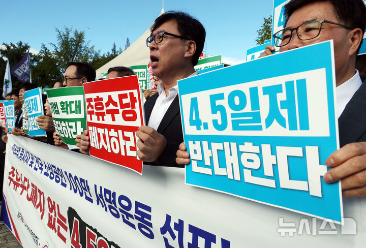 [서울=뉴시스] 고승민 기자 = 소상공인연합회, 한국외식업중앙회 회원들이 15일 서울 여의도 국회 앞에서 주휴수당 폐지, 주 4.5일제 반대 기자회견을 하고 있다. 2025.10.15. [email protected]