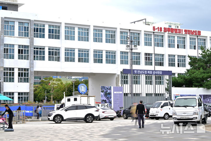 [광주=뉴시스] 이영주 기자 = 원형 복원 공사가 이뤄지고있는 광주 동구 옛 전남도청 본관 건물이 15일 가림막을 벗은 채 새단장한 모습을 보여주고 있다. 옛 전남도청은 내년 5월 정식 개관을 앞두고 있다. 2025.10.15. [email protected]