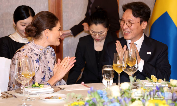 [서울=뉴시스] 추상철 기자 = 김민석 국무총리가 15일 오후 서울 종로구 국무총리 공관에서 열린 환영만찬 행사에서 빅토리아 잉그리드 알리스 데씨리에 스웨덴 왕세녀와 대화하고 있다. 2025.10.15. [email protected]