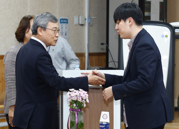 [서울=뉴시스] 조성우 기자 = 정근식 서울시교육감이 15일 서울 종로구 보건안전진흥원에서 '흰지팡이의 날'을 맞아 열린 함께하는장애인교원노조 서울지부와 2025년 하반기 소통 간담회에서 참석자와 악수하고 있다. (사진=서울시교육청 제공) 2025.10.15. [email protected] *재판매 및 DB 금지