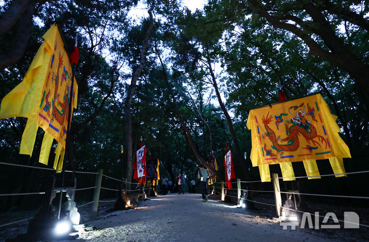 [서울=뉴시스] 황준선 기자 = 지난 15일 서울 강남구 선정릉에서 열린 2025 세계유산 조선왕릉축전 언론공개 행사에서 참가자들이 야간 미디어 아트 전시 '왕가의 산책'을 체험하고 있다. 2025.10.16. [email protected]