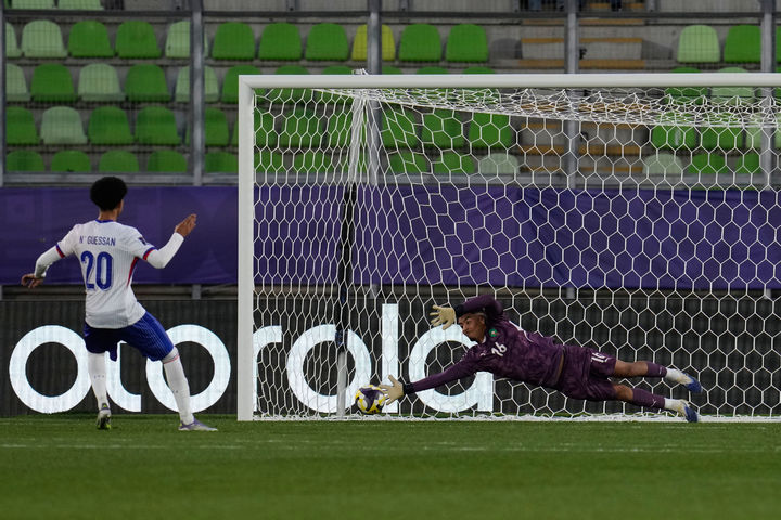[발파라이소=AP/뉴시스] 모로코 골키퍼 압델하킴 메스바히가 15일(현지 시간) 칠레 발파라이소의 에스타디오 엘리아스 피게로아 브란데르에서 열린 2025 국제축구연맹(FIFA) 20세 이하(U-20) 월드컵 준결승 승부차기에서 프랑스의 슛을 막아내고 있다. 메스바히는 연장 후반 추가시간 승부차기에 대비해 교체 출전했다. 모로코는 연장까지 1-1로 비겨 승부차기 끝에 프랑스를 5-4로 꺾고 사상 처음으로 결승에 진출했다. 2025.10.16.