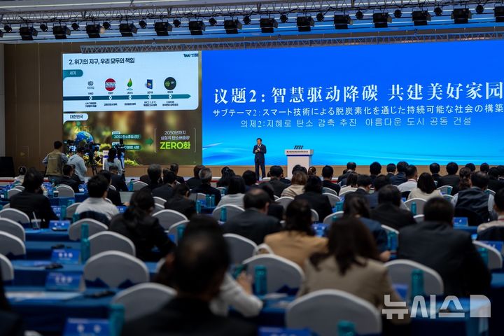 [증평=뉴시스] 서주영 기자 = 이재영 충북 증평군수가 16일 중국 장수성 옌청시의 컨벤션센터에서 열린 26회 한·중·일 지방정부 교류회의에 참석해 발언하고 있다. (사진= 증평군 제공) 2025.10.16. [email protected]