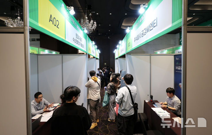 [서울=뉴시스] 이영환 기자 = 16일 오전 서울 서초구 엘타워에서 열린 2025 기후에너지 일자리 박람회에서 구직자들이 채용상담을 받고 있다. 2025.10.16. [email protected]