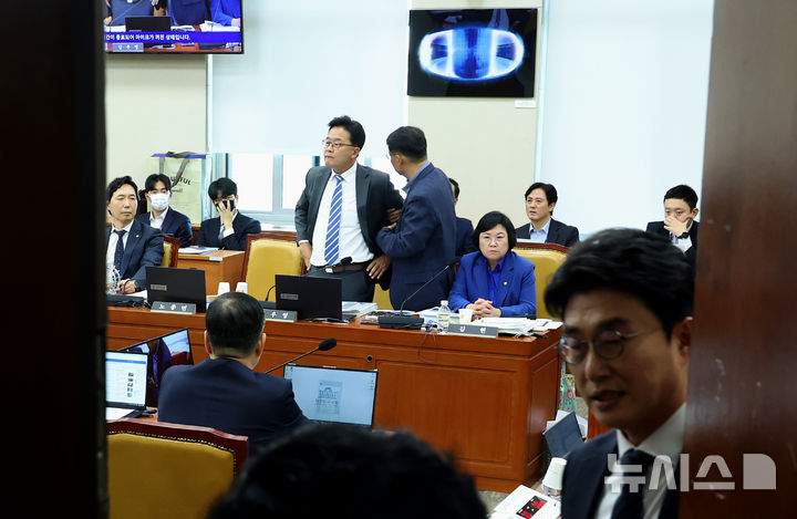 [서울=뉴시스] 고승민 기자 = 16일 서울 여의도 국회에서 열린 과학기술정보방송통신위원회 국정감사가 최민희 위원장에 의해 언론 비공개로 전환된 가운데 김우영 더불어민주당 의원이 노기를 띠고 일어서 있다. 2025.10.16. [email protected]