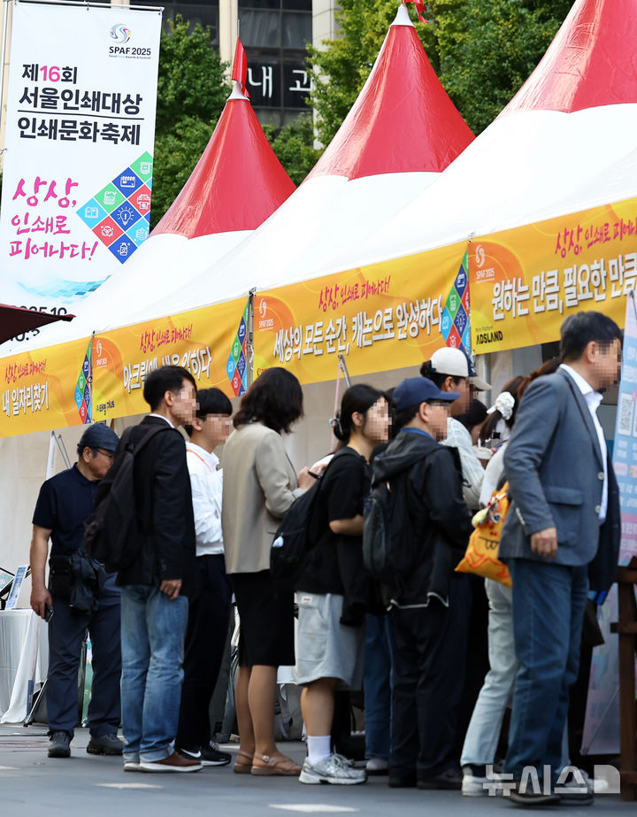 [서울=뉴시스] 최진석 기자 = 16일 서울 중구 청계광장에서 열린 제16회 서울인쇄대상 및 인쇄문화축제를 찾은 관람객들이 체험을 하고 있다. 2025.10.16. [email protected]